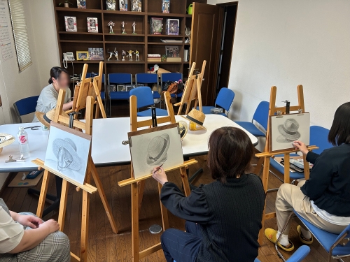 形に沿った縦横の線を引いて立体感を引き立てながら、光の方向を意識して大まかに濃淡を付けていきましょう。