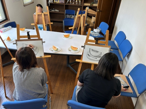 カットされたメロンは種の周辺を含め自然物の形をよく観察して捉えましょう。